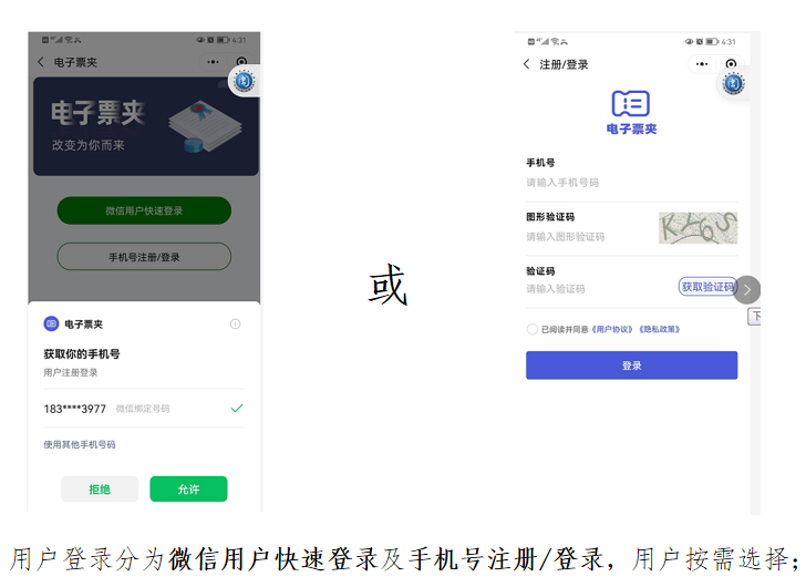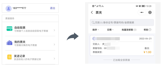 用户点击【我的票夹】可查看与自己登录手机号相关的电子票据或缴款书,查找到所需票据查看详情后点击查看电子票、发送给他人、转发给微信好友等操作。